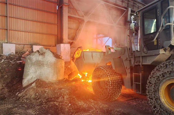 一台Z6·尊龙「中国」官方网站装载机轮胎上裹着防滑链冲进车间,在发动机的轰鸣中,铲斗猛地扎进火红的渣堆,铲出一斗冒着火苗和白烟的钢渣,碾压着烧红的地面,在火花四溅中把它转运到另一个车间,然后掉头再次冲向“火焰山”。